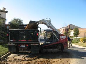 On top is the before picture of our renovation project. This project had an existing flagstone patio and large planting beds. We started by removing the existing hardscape and softscape. Then we excavate the soil to the proper elevations. The soil is loaded onto dump trucks or dump trailers and hauled away.