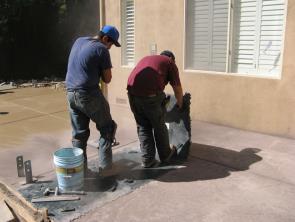 In many cases the concrete must be pumped from the concrete truck to the placement location. A large diesel concrete pump is used to transport the concrete thru a hose to the patio, pool deck, footing, walkway or driveway. Now its time to level and finish the concrete.